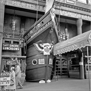 The entrance to Bernstein’s Fish Grotto at 123 Powell was a faithful reproduction of Columbus’s flagship, the Nina. The location is now a shoe store.