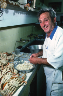 Those who drop in for a bowl of chowder or some oysters or to take something home for dinner – perhaps a piece of fresh halibut or that elegant local sole called petrale – become “family” and are treated as such. Early strict family training has obviously paid off. The Sancimino brothers, indeed the entire shop, appear to have been sealed in Saran Wrap in gentler, more salubrious times and unwrapped today for our pleasure.