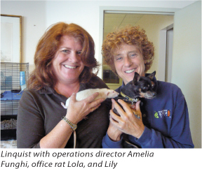 Back in Lindquist’s office, we meet her menagerie: mice, birds, two rats named Lola and Sass, and a tiny Chihuahua named Lily whose tongue hangs out to one side where she is toothless. “I was judging a charity contest at the Marin Fairgrounds and Lily won ‘Ugliest Dog’ – she was a stray – old and crunchy and pretty shut down. She’s opened up a lot, and she’s hysterical – she rules my pit bulls at home.”