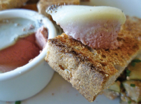 Tang, known by colleagues as “The King of Pork” after winning a national pork-cooking contest, is a critically acclaimed chef with some serious chops (and I’m not just talking the swine kind). After stints on the East Coast including Daniel Boulud’s four-star Daniel, Tang moved west to work with Wolfgang Puck at Postrio and to help Nancy Oakes open Boulevard. His own restaurant, Mariposa, became a wine country destination in Windsor (people still talk about the pork belly). This summer at PSC, Tang is bringing back his popular Sunday night pig roast. He recently added a Monday night clambake that reminded me of my summers in Rhode Island (no small feat) with the best-cooked lobster I’ve had in ages – not watery and not rubbery, poached in butter with a little smokiness from the grill – with mussels, clams (not steamers, unfortunately, but tender little West Coast clams), corn, and potatoes all nestled beside a bed of smoky seaweed in parchment paper. Our first lunch visit had a bumpy start with the hostess. When I told her the parking machine ate my credit card she became argumentative, telling me that was the Presidio’s problem even though I tried to explain it was the restaurant’s problem if customers couldn’t get past the parking lot. But the visit improved once we were seated next to a sunny window in the lovingly restored military barracks overlooking the beautiful grounds near the Presidio’s Lombard Gate. When the antipasti ($4 each or three for $10) and other starters hit the table, it got even better.