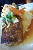 (served with succotash) The menu moves effortlessly from a childhood favorite to more sophisticated fare like the delicate grilled sardines with shaved fennel ($9). Chicken liver pate ($6) is done right, with the schmaltz (rendered fat) poured over the top, forming a waxy seal. Dipping the spoon is like digging for treasure, which you find in the mousse-like pate beneath. I could have lived without the meatballs with pine nuts and currants ($8), but that’s because I prefer my meatballs savory rather than sweet. Crab cake sliders ($12) were packed with Dungeness crab and topped with a spicy slaw and aioli that didn’t upstage the crustacean. The house-made ricotta with roasted garlic spread ($6) was a winner, but possibly the best starter on the menu, despite its misleading name is the pan-sautéed calamari doré ($10). Calamari doré, a pounded squid steak dipped in egg batter and pan fried, is a venerable classic (the version at Old Fisherman’s Grotto on the wharf is the best in the City), but PSC’s take is more of a frittata with tender squid tentacles and tubes poking out of warm, soft-cooked eggs. Salinity from Kalamata olive slices adds a nice kick. ![]() Meatloaf