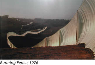 Over a two-week period in February 2005, The Gates adorned Central Park with thousands of saffron panels draped inside a total of 7,503 gates spanning over 23 miles of the parks’ walkways. Running Fence, a project completed in 1976, consisted of steel bolts and cables connected by an 18-foot white fabric fence running nearly 25 miles over the hills of Sonoma and Marin counties, with the end of the fence plunging directly into the Pacific Ocean. These ambitious projects stood in completion for only a few days and cost millions of dollars, financed exclusively by the artists themselves. They secured the funds through the sale of the preliminary pictorial studies, collages, and scale models of their designs to museums and collectors. State and local organizations as well as private landowners also had to be courted and convinced to provide Christo and Jeanne-Claude with permission to use the land.