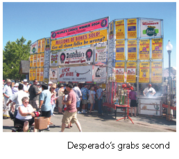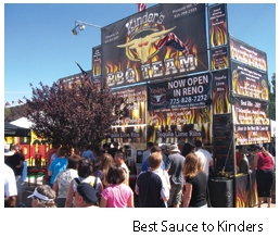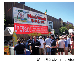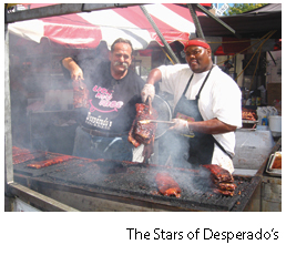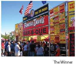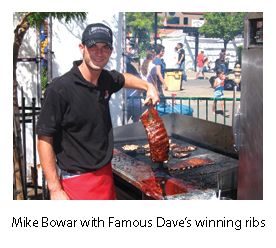 Last year, there was an unprecedented three-way tie for first place. The head judge broke the deadlock. The winner – Famous Dave’s BBQ from Plymouth, Minn. – got to double dip, winning both the judges’ vote as well as the people’s vote. According to Mike Bowar, the team leader for Famous Dave’s, the secret lies in attention to detail – pulling the ribs out of the pit when they’re done (about four to six hours), holding them for about an hour before putting them back on the grill with sauce to caramelize (about 30 seconds), and then resaucing them after they’re off the grill. The result: rich ribs with a sweet sauce.